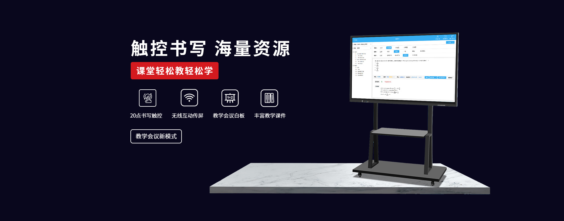 〔教育智慧黑板〕 是新一代教學顯示設備,具有高清顯示、高精度觸摸操作應用,黑板書寫教學功能與一身;內置安卓、windows系統,可滿足教學不同的應用軟件使用;純平面書寫黑板,適應粉筆,無塵粉筆、水性粉筆書寫,適合不同環境應用;觸摸切換書寫黑板與屏幕顯示,可讓老師快速進行教學應用切換;純平面外觀,解決傳統推拉黑板的笨重,復雜的結構特點,大大提升了教師授課的體驗感和演示效果。